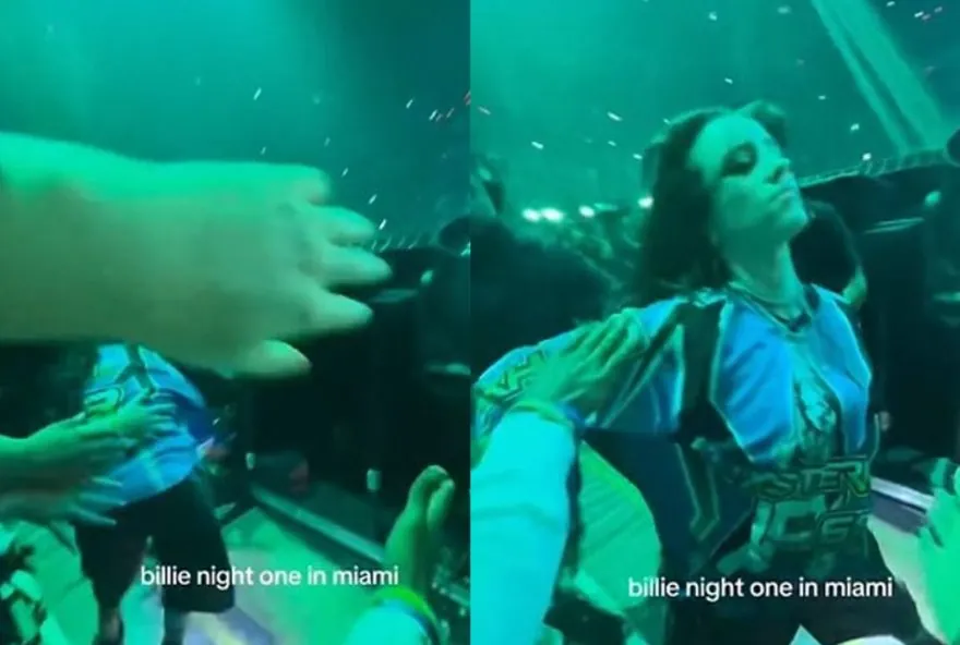 Billie Eilish sofreu um incidente durante um show em Miami, onde acabou caindo após ter seu braço puxado com violência por um espectador na grade. O episódio ocorreu na noite de quinta-feira (9) e foi registrado em vídeos compartilhados nas redes sociais, onde é possível observar um homem puxando o braço da cantora enquanto ela interagia com os fãs na grade.