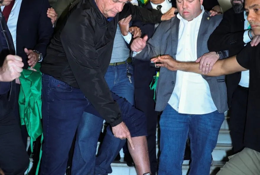 Bolsonaro mostra tornozeleira após encontro com deputados aliados na Câmara em 21 de julho. — Foto: Adriano Machado/Reuters