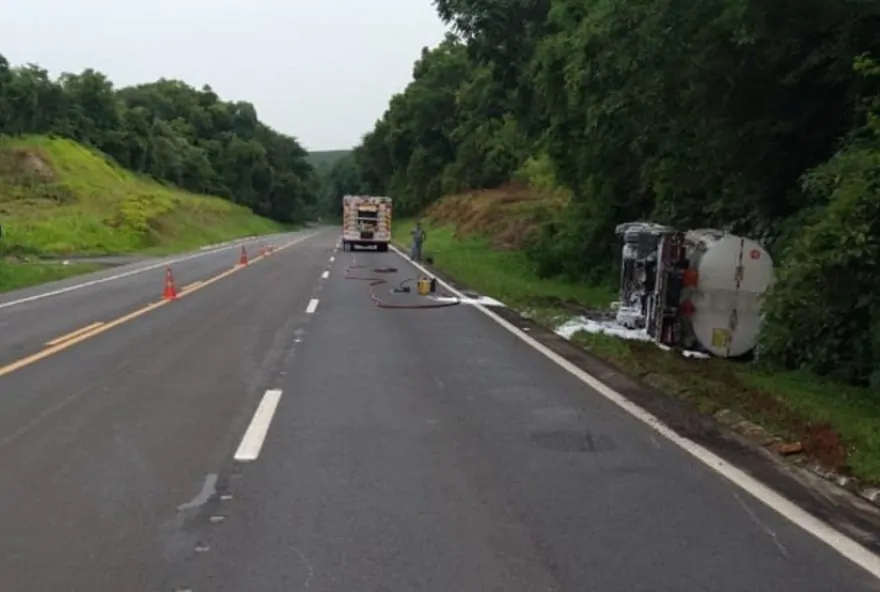 Segundo o Corpo de Bombeiros, parte do combustível que estava na carga do veículo caiu na pista, mas o vazamento foi contido.