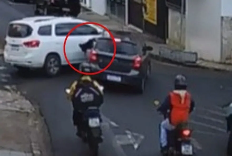 Câmeras registraram o momento em que um carro avança o pare e o cãozinho é lançado do veículo em cruzamento de Uberlândia. Câmeras mostram tutora saindo do carro em busca dele.