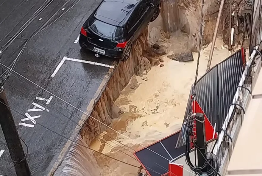 Uma calçada cedeu e quase ‘engoliu’ um carro que estava estacionado em uma rua de Santos, no litoral de São Paulo. O desastre ocorreu na tarde desta quarta-feira, 24, durante uma tempestade que atingiu a cidade e demais municípios da Baixada Santista.