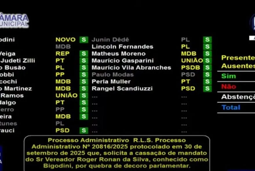 A Câmara Municipal de Ribeirão Preto, no estado de São Paulo, votou nesta quarta-feira (1º) pela criação de um Conselho de Ética para analisar a cassação do mandato do parlamentar Roger Ronan da Silva, mais conhecido como Bigodini (MDB). Dos 21 parlamentares presentes, 20 optaram pela abertura do processo, sendo que o presidente da Casa, Isaac Antunes (PL), não participou da votação. O requerimento do processo administrativo foi feito pelo jornalista Rodrigo Leone da Silva e protocolado na Câmara de Vereadores na terça-feira (30).
