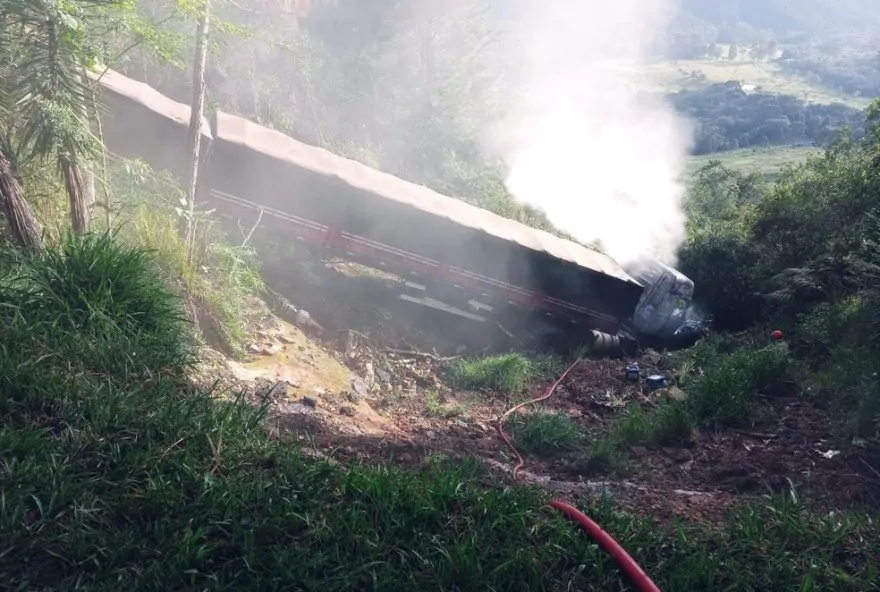 Caminhão bitrem cai em ribanceira e pega fogo na BR-277, Paraná: motorista é socorrido com ferimentos leves