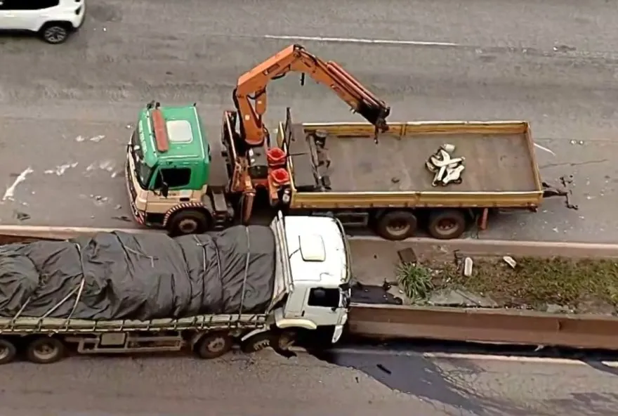 Um acidente envolvendo um caminhão provocou interdição e retenção na BR-381, km 525, em Brumadinho, Região Metropolitana de Belo Horizonte, nesta segunda-feira. A empresa responsável pela via, Arteris, informou que o veículo colidiu contra a mureta, deixando a faixa da esquerda interditada no sentido São Paulo, com aproximadamente dois quilômetros de congestionamento. A ocorrência foi registrada pela manhã, sendo que o caminhão transportava cerca de 18 toneladas de sucata. O motorista sofreu ferimentos leves e foi levado ao Hospital Regional de Betim, também na Região Metropolitana. As equipes aguardam autorização para a remoção do veículo, sem previsão de liberação total da pista.