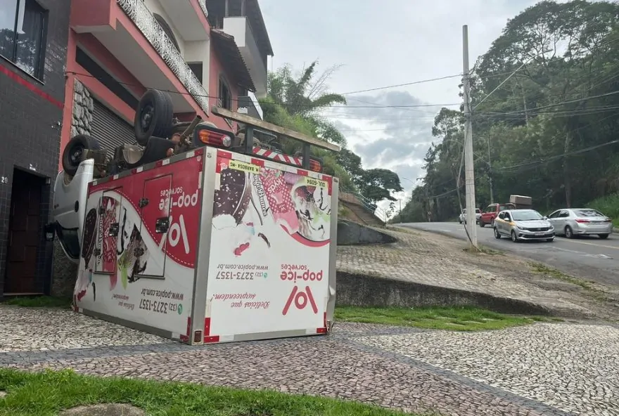 Um caminhão de sorvetes capotou na descida da Garganta do Dilermando, sentido Centro, na tarde desta quinta-feira (23), em Juiz de Fora. O veículo ficou com as rodas para cima sobre a calçada.