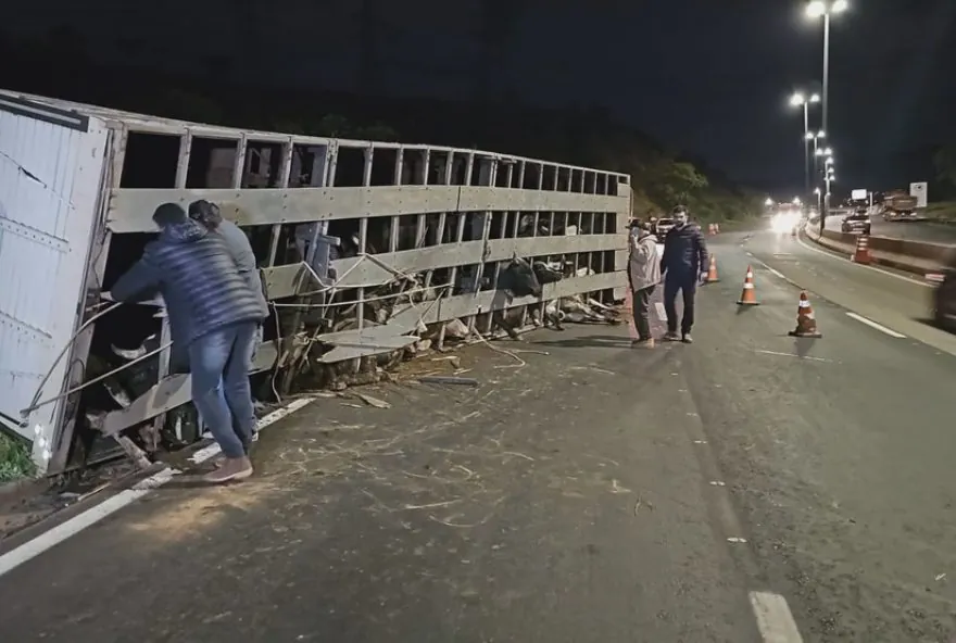 Caminhão carregado com bois tomba no Anel Rodoviário de Belo Horizonte