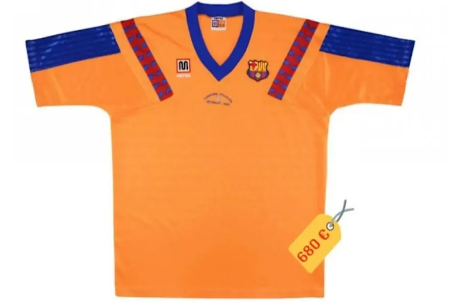 A camisa laranja do DE na temporada 91/92 teve um papel fundamental na história do time, sendo o uniforme em que o Barça levantou sua primeira taça da Champions League. Com um gol inesquecível de falta batido por Ronald Koeman na final contra a Sampdoria, esse uniforme histórico custa cerca de 680 euros, aproximadamente R$ 4 mil reais. Já a camisa 2 do Napoli na temporada 90/91, usada por Maradona, é vendida por 570 euros, aproximadamente R$ 3,4 mil reais, marcando um período glorioso do time italiano.