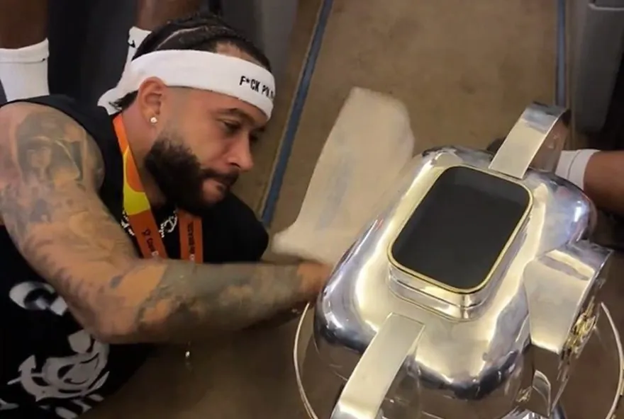 Depay, autor do gol do título, “limpando” a taça da Copa do Brasil.