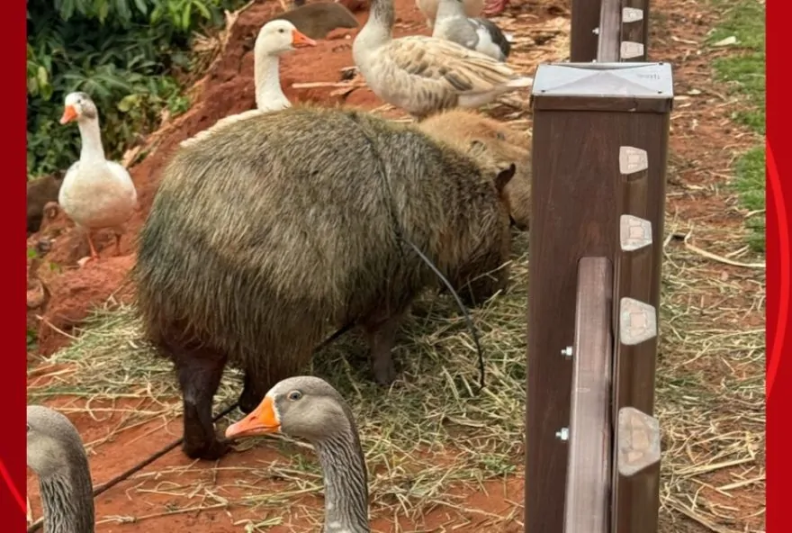 Uma capivara foi flagrada em Paranavaí, no noroeste do Paraná, amarrada por um fio de telefonia. Comerciantes que estavam na região do Parque Ouro Branco viram a situação e salvaram o animal.
