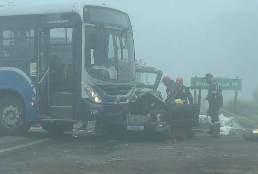 Com o impacto, o capô do carro ficou preso sob o ônibus. As condições climáticas desfavoráveis, com forte cerração e neblina, podem ter contribuído para o acidente.
