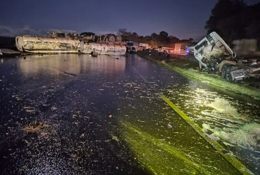 Com o impacto da colisão, os semirreboques acabaram se soltando do cavalo-trator e derramando uma carga de óleo vegetal na pista, sem atingir nenhum outro veículo que passava pela região.