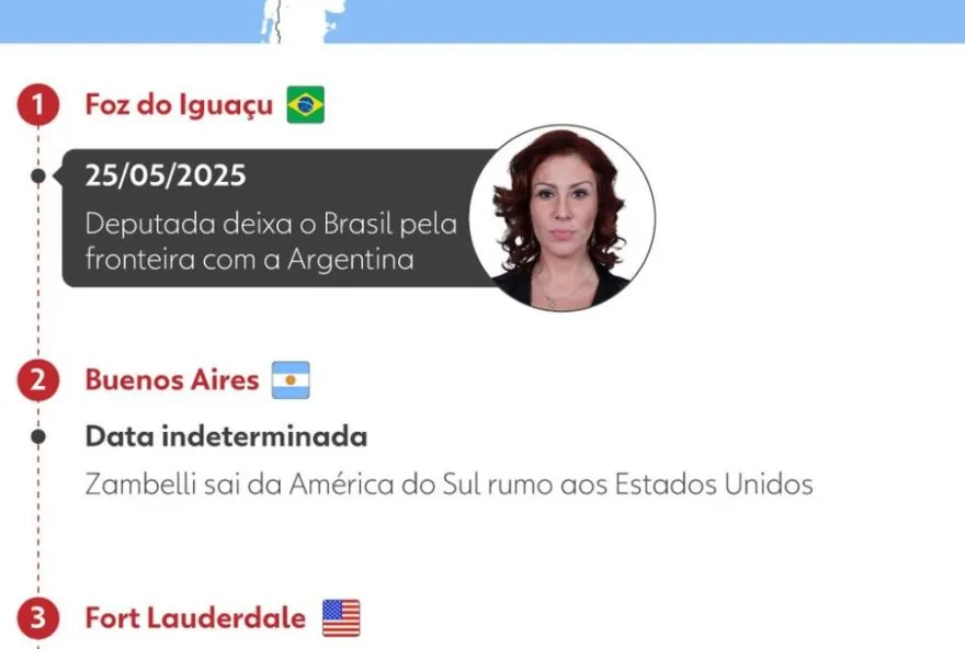 Zambelli deixou o país pela fronteira com a Argentina e estava na Itália — a parlamentar tem cidadania italiana. Em junho, ela teve o nome inserido na lista de procurados da Interpol e teve condenação mantida pela 1ª turma do Supremo Tribunal Federal (STF).
