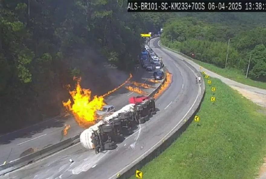 Uma carreta carregada de combustível tombou no Km 233 da BR-101, sentido sul, em Palhoça, na Grande Florianópolis, no início da tarde de domingo (6/4). O acidente ocorreu próximo ao Morro dos Cavalos, resultando na explosão da carga e em um incêndio.