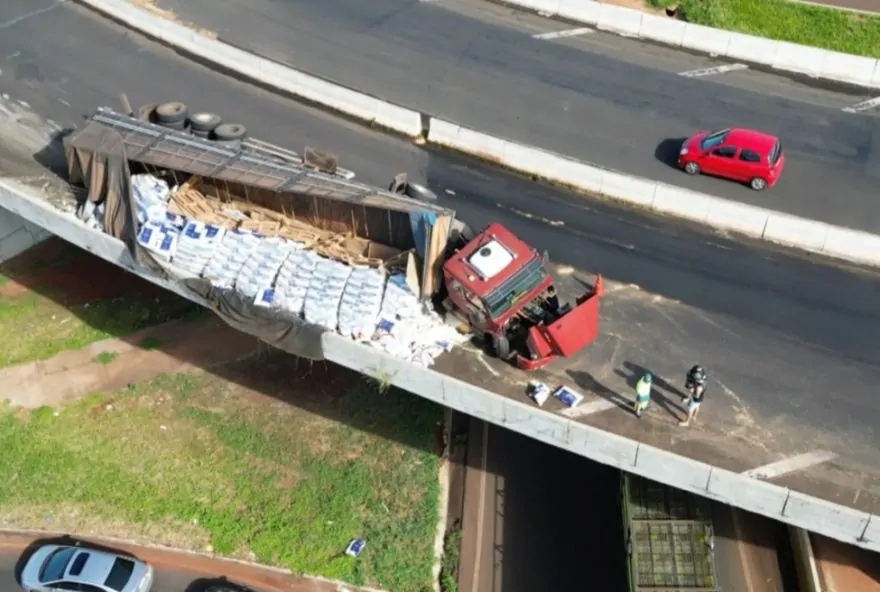 Carreta carregada com ração animal tomba e interdita faixa do contorno norte da