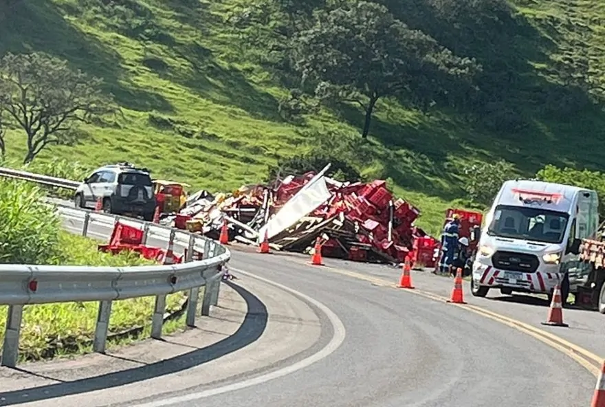 Segundo a concessionária que administra o trecho, a carreta foi destombada, mas o tráfego flui pelo sistema Pare e Siga para a limpeza completa da pista.