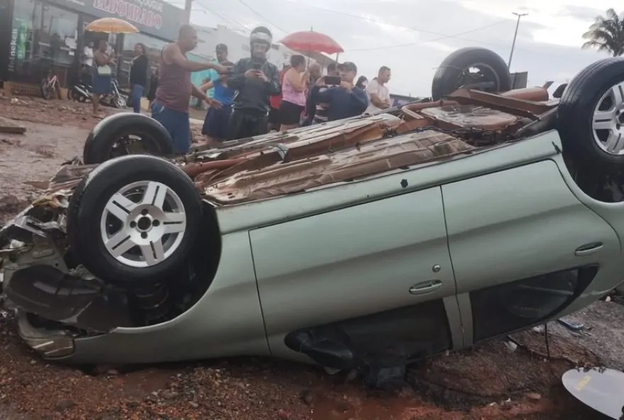 Carro é arrastado e vira com as rodas para cima após chuva no DF; veja estragos