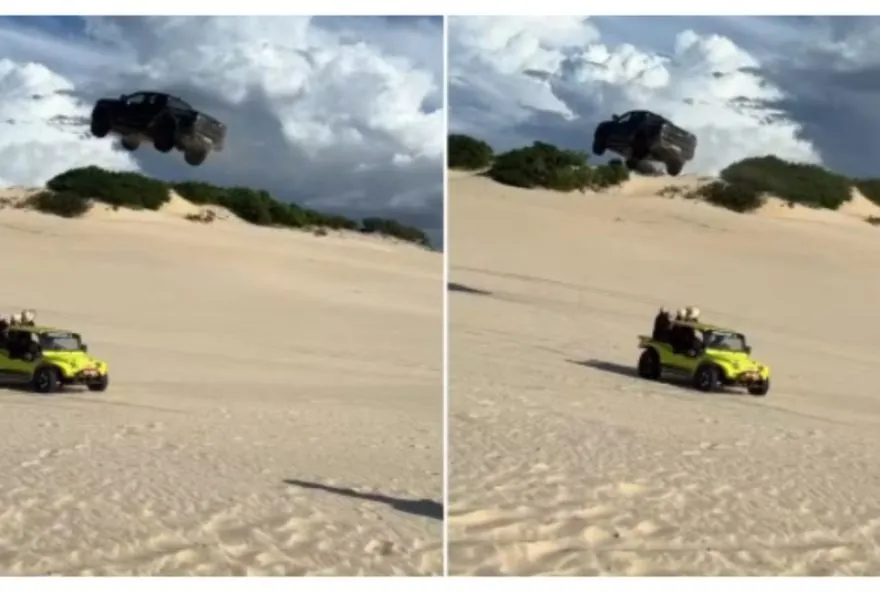 Canoa Quebrada, em Aracati (CE), viralizaram em maio. Nas imagens, a picape ganha velocidade, sobe a duna e chega a passar por cima de um buggy parado no local, onde há pelo menos um motorista e três passageiros.