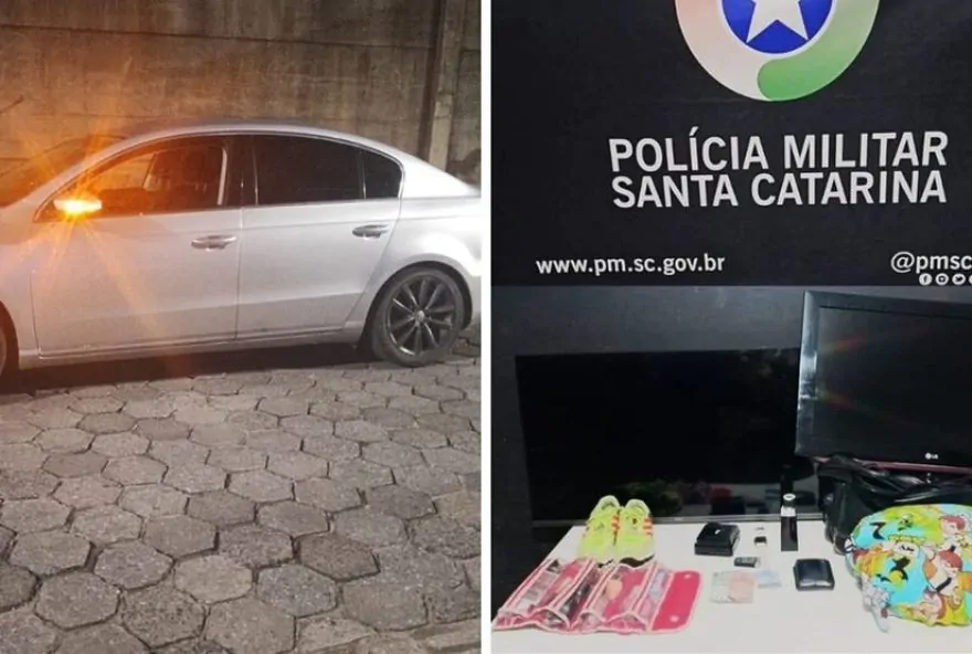 Carro onde criminosos foram localizados e, ao lado, parte dos itens levados — Foto: Polícia Militar/Divulgação