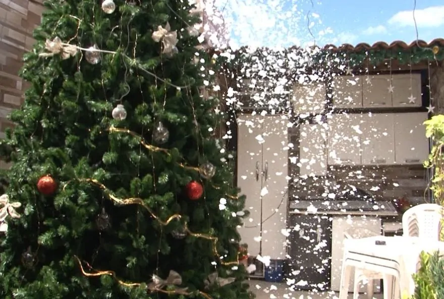 Com o tempo – e o acúmulo dos enfeites guardados Natal pós Natal – ela atingiu o ápice em 2024 e fez nevar em plena “Princesa do Sertão”, com uma máquina que produz neve artificial instalada no quintal. O equipamento surpreende sobretudo as crianças.