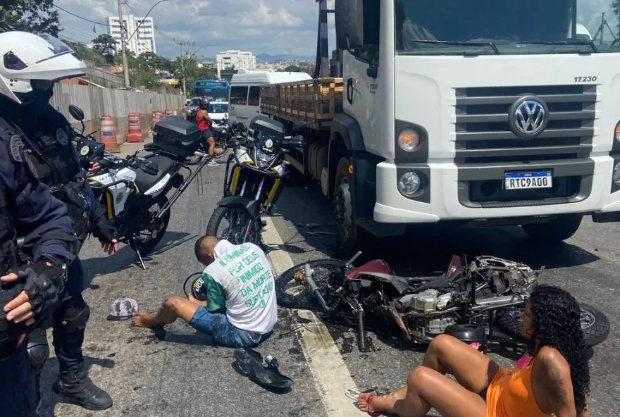 Posteriormente, a moto com os dois ocupantes colidiu com um caminhão, resultando em ferimentos para ambos.