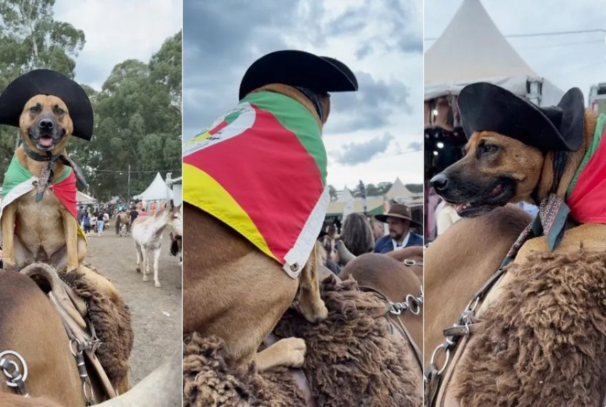 No meio da poeira levantada pelos cascos e do som das gaitas no Rodeio Internacional de Vacaria, uma figura improvável virou xodó do público. Com o chapéu adaptado na cabeça, lenço no pescoço e a bandeira do Rio Grande do Sul junto ao corpo, a cadela Catarina desfila ao lado do tropeiro Rosmar Lima e arranca aplausos por onde passa. As pessoas param e pedem fotos.