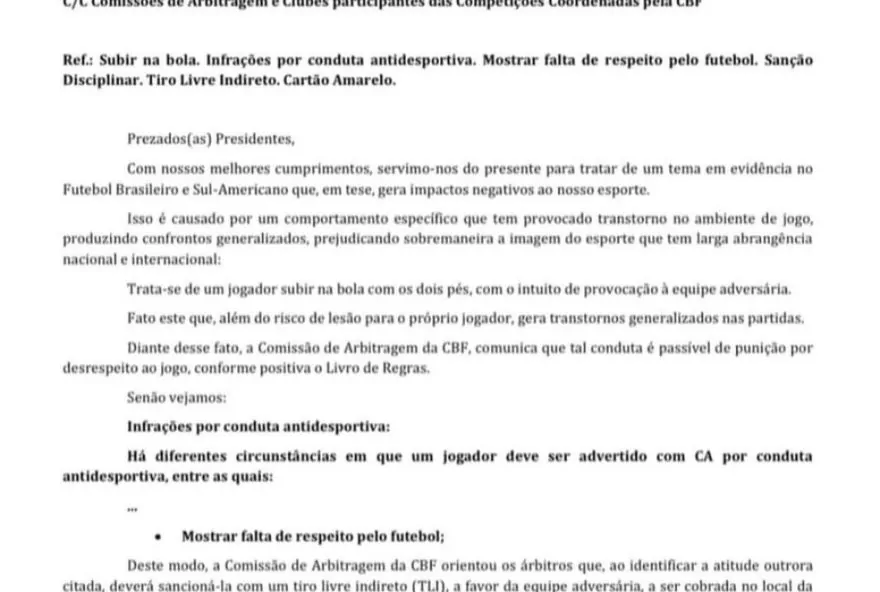A CBF emitiu um comunicado aos clubes informando que vai punir os jogadores que subirem na bola durante os jogos do Campeonato Brasileiro. O aviso veio em um ofício enviado na última sexta-feira, no qual a entidade deixou claro que os árbitros deverão aplicar tiro livre indireto e cartão amarelo ao responsável pela ação. Essa nova regulamentação surge após o episódio envolvendo o jogador holandês Memphis Depay, do DE, que utilizou esse artifício na decisão do Paulistão contra o Palmeiras.