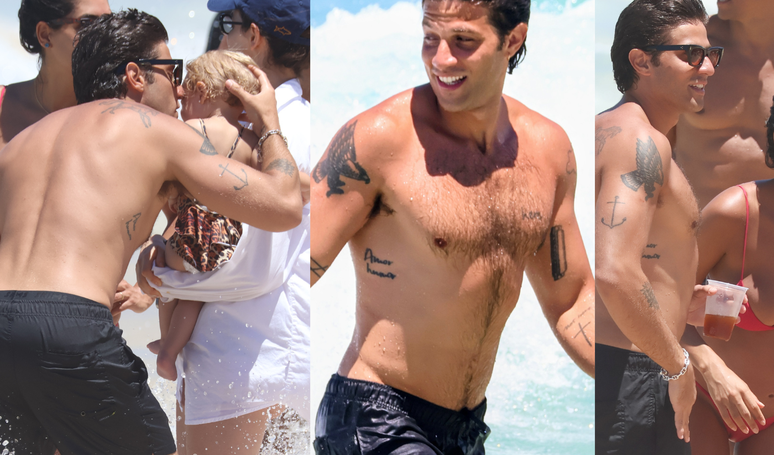 Chay Suede curte dia de praia em família com esposa Laura Neiva e filhinha de 1 ano: amor e cumplicidade em cliques especiais