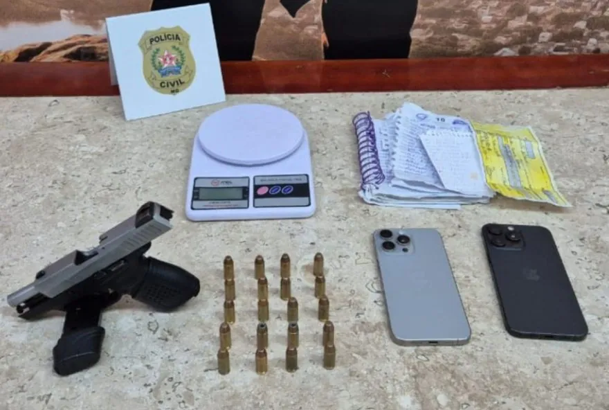 No imóvel, os policiais apreenderam uma pistola calibre .40 com numeração raspada, 20 munições, dois celulares, uma identidade falsa, uma balança de precisão e um caderno com registros contábeis da organização criminosa. Também foi encontrada uma nota promissória de R$ 30 mil.
