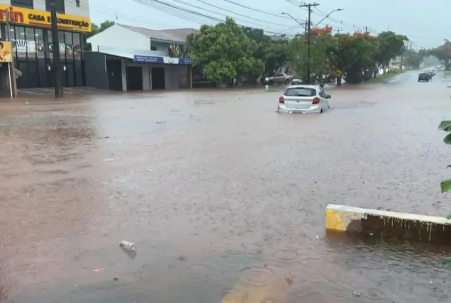 Algumas ruas ficaram alagadas e a água entrou em alguns estabelecimentos da cidade. É possível ver também nas imagens um veículo que tentou atravessar a rua alagada, mas não conseguiu.