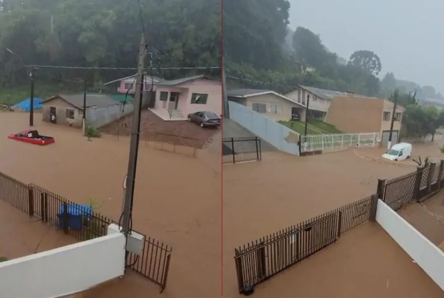 Chuva forte alaga ruas em Palmas, Paraná – Simepar registra 99,4 mm de precipitação na cidade, deixando carros submersos.