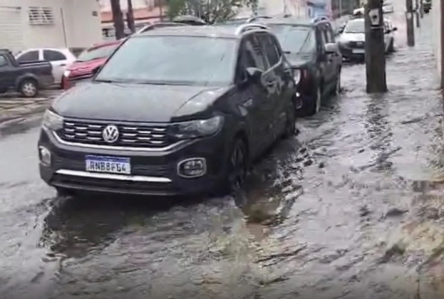 A avenida Vereador Dante Jordão Stoppa ficou alagada em frente a um posto de combustíveis. Poucos metros a frente, ainda na mesma avenida, a calçada de um condomínio também ficou alagada.