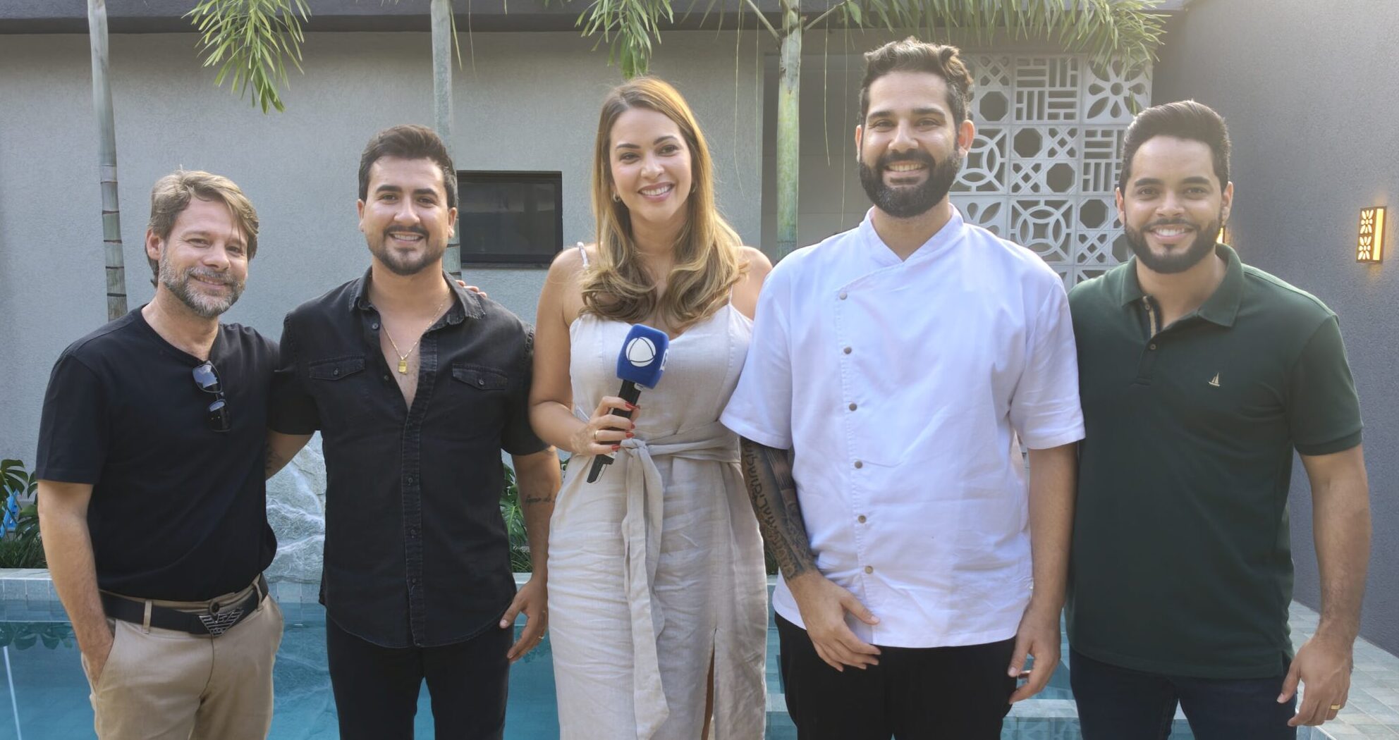 NA TELINHA – A dupla Vitor & Luan participou da gravação do Agro Record Goiás no dia 26 de novembro, antecipando a animação que levarão ao Réveillon Caldas Paradise, com gastronomia assinada pelo chef Arthur Fabrício. O programa vai ao ar neste domingo, às 10h, na Record TV. Na foto, Christian Gomide, Vitor, a apresentadora Nayhara Moura, o chef Arthur Fabrício e Luan (Foto: Leo de Jesus)