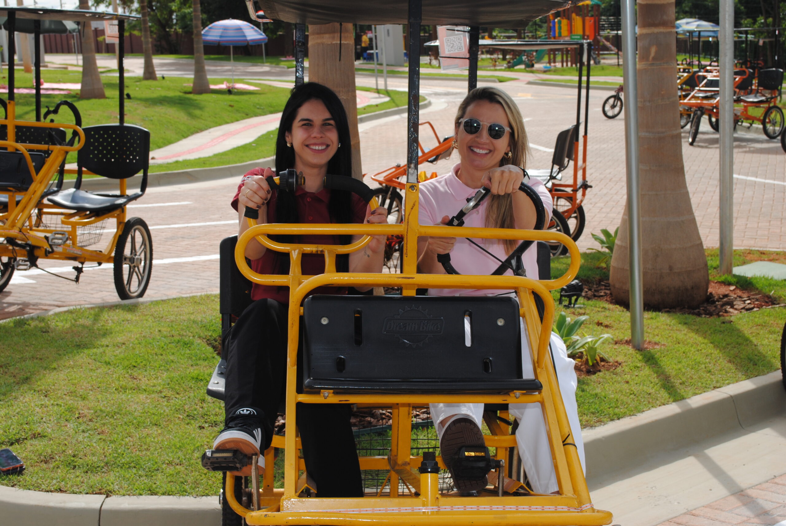 EMPREENDIMENTO – Laleska Ramos e Carolina Assis, coordenadoras de relacionamento da FGR Incorporações, fizeram uma pausa nos preparativos do evento Jeito Jardins de Viver, que marcou a entrega do Jardins Cannes, para um registro descontraído em um dos quadriciclos usados pelos futuros moradores no condomínio em Aparecida de Goiânia