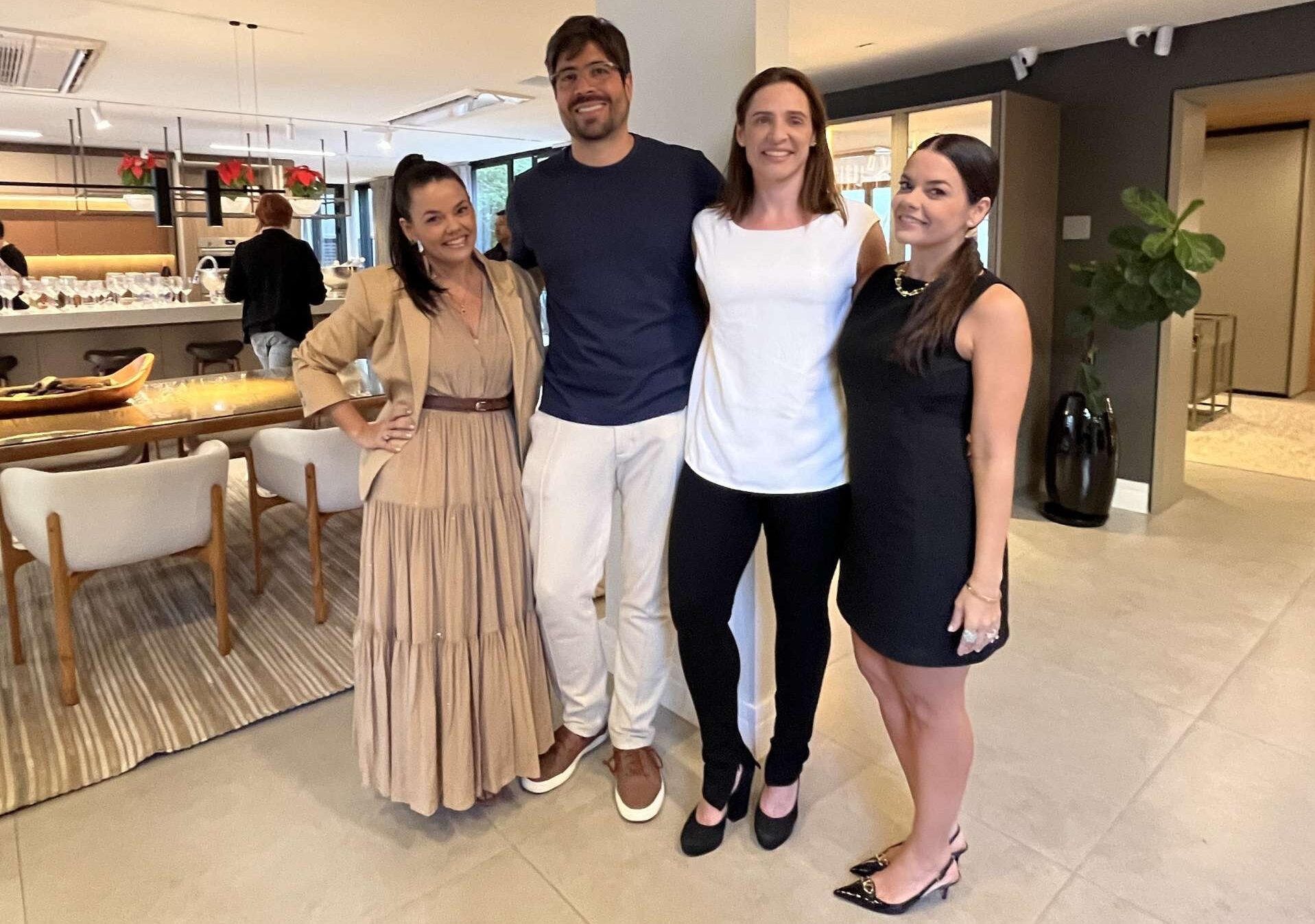SHOWROOM – Os empresários Lívia Azevedo e João Nelson de Azevedo Júnior receberam integrantes do grupo AgroPatys para um encontro intimista no showroom da Bontempo Goiânia, celebrando o protagonismo feminino no agronegócio. A noite contou com menu degustação da chef Lorena Calil e harmonização especial, em um ambiente elegante e acolhedor. Na foto, Michelle Valente, Joâo Nelson de Azevedo Junior, Livia Azevedo e Monique Valente (Foto: Alessandra Gomes)