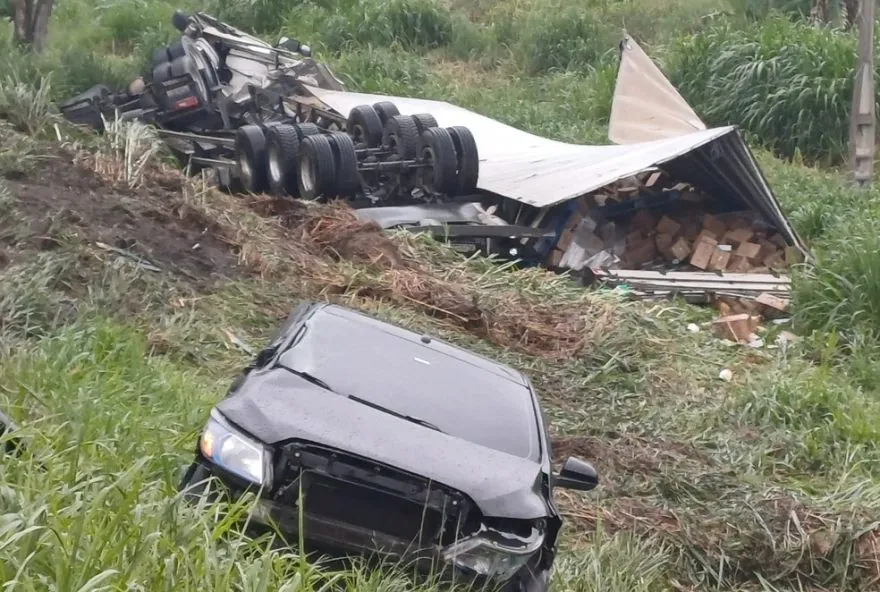 Com o impacto da batida, o carro e a carreta caíram em um terreno às margens da Dutra. Os veículos ficaram danificados e a carga da carreta, que transportava sucos em caixas, ficou esparramada na área.