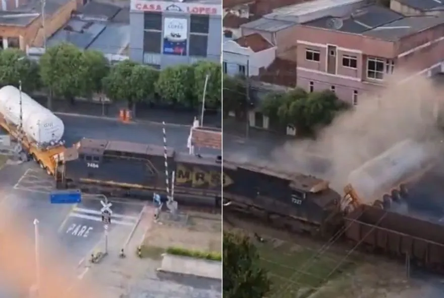 A colisão entre um trem de carga e uma carreta que transportava um tanque de gás vazio causou um grande susto na manhã desta quarta-feira em Paraíba do Sul, no Centro-Sul Fluminense. Apesar do impacto, felizmente não houve feridos no acidente. Um vídeo gravado no momento da colisão mostra a composição do trem acionando a buzina antes de se chocar com o caminhão, destruindo uma cancela e parte do muro de concreto onde estava baseada. O incidente gerou fumaça no local, mas as autoridades competentes agiram rapidamente para garantir a segurança da área.