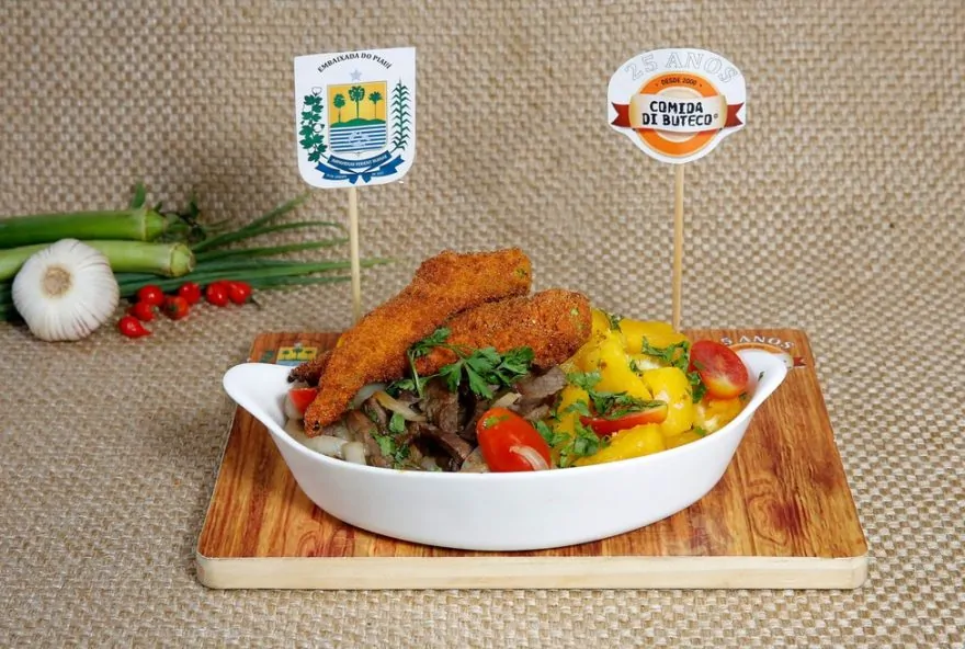 O Trio Piauí é a aposta do Embaixada do Piauí para o Comida di Buteco 2025. A iguaria é composta por mandioca cozida, carne de sol acebolada, quiabo frito e cheiro-verde.
