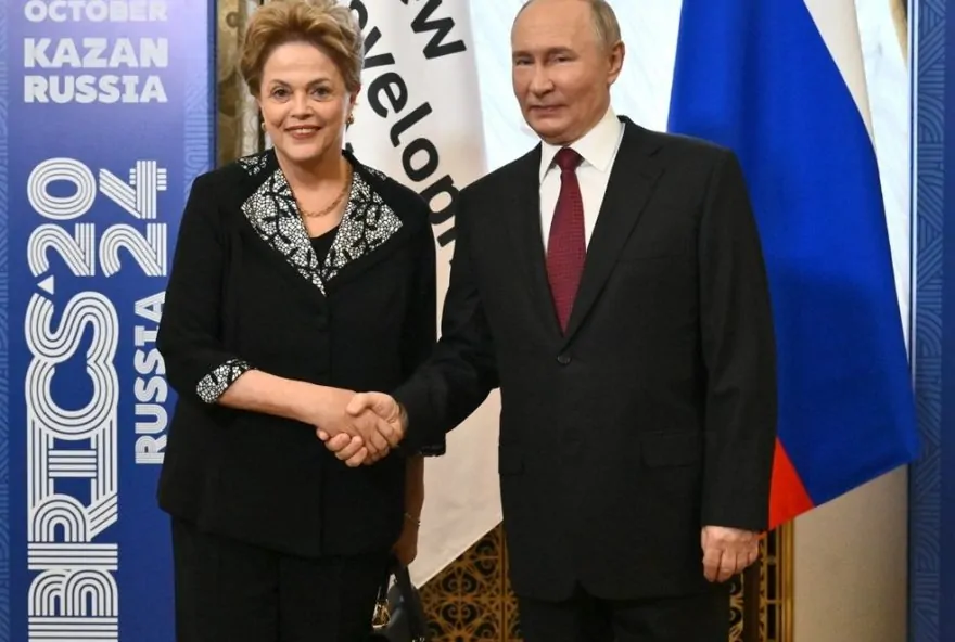 Dilma Roussef, presidente do Banco dos Brics, se encontra com Vladimir Putin, presidente da Rússia na reunião de cúpula em Kazan — Foto: Kristina Kormilitsyna/ Brics