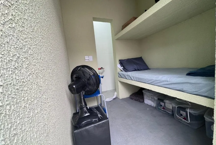 Martins está em uma cela nova, com banheiro individual, chuveiro, beliche, ventilador, TV de 20”, mesa e cadeira, afastado de outros presos. Banhos de sol feitos numa área anexa.