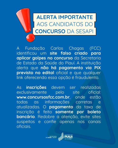 Sesapi faz alerta contra site falso para inscrições em concurso público