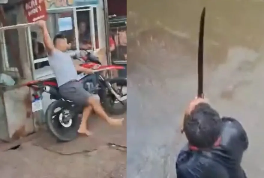 Pelas imagens é possível ver a correria e as agressões. Um homem com um terçado chega a pular no rio.