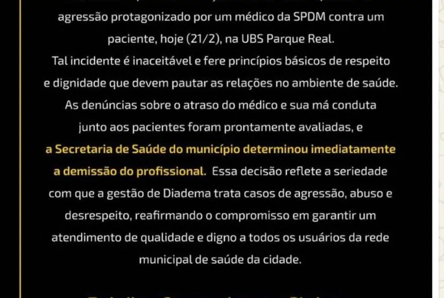 “Essa decisão reflete a seriedade com que a gestão de Diadema trata casos de agressão, abuso e desrespeito, reafirmando o compromisso em garantir atendimento de qualidade a todos os usuários da rede municipal de saúde da cidade”, disse o prefeito.
