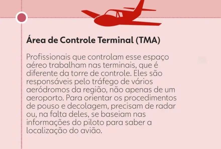 – Área de Controle Terminal (TMA): os profissionais que controlam esse espaço aéreo trabalham nas chamadas terminais, que é diferente da torre de controle. Eles são responsáveis pelo tráfego de vários aeródromos da região, não apenas de um aeroporto. Para orientar os procedimentos de pouso e decolagem, os controladores precisam de radar ou, na falta deles, se baseiam nas informações do piloto para saber a localização do avião.