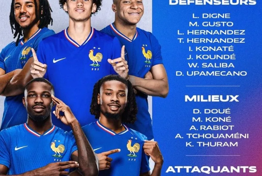 Entre os convocados estão goleiros como Chevalier, Maignan e Samba, defensores como Koundé, Konaté, Upamecano, Saliba, Theo Hernandez, Lucas Hernández, Lucas Digne e Malo Gusto, além de meio-campistas como Manu Koné, Tchouaméni, Rabiot, Khéphren Thuram e Désiré Doué. Os atacantes Dembélé, Marcus Thuram, Rayan Cherki, Barcola, Kylian Mbappé, Maghnes Akliouche e Michael Olise completam a lista.