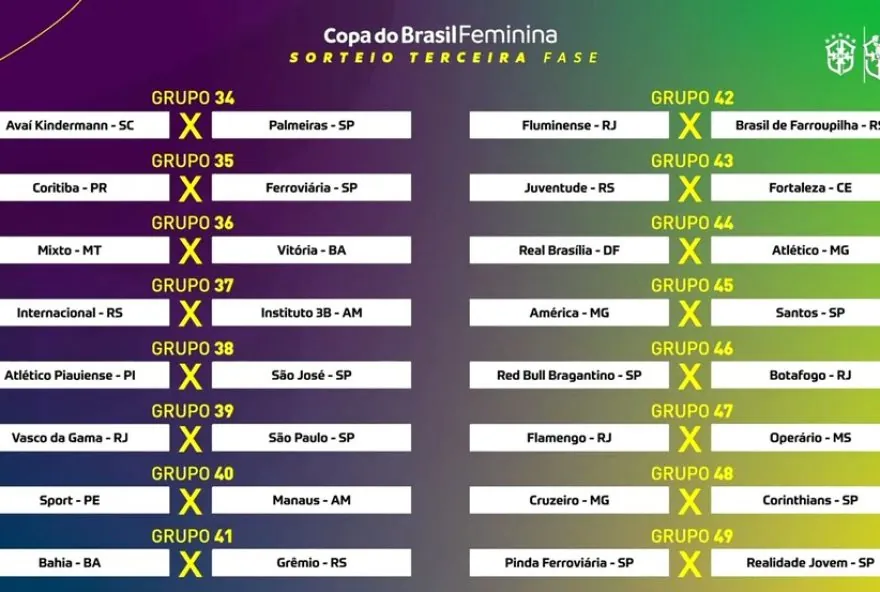 A terceira fase da Copa do Brasil Feminina 2025 promete emoção e grandes disputas nos dias 5 e 6 de agosto. Com jogos únicos, as equipes buscarão garantir vaga nas oitavas de final, em confrontos que prometem muita emoção. A tabela detalhada da competição foi divulgada pela Confederação Brasileira de Futebol (CBF) e contará com a participação de 16 equipes da Série A1 do Campeonato Brasileiro.
