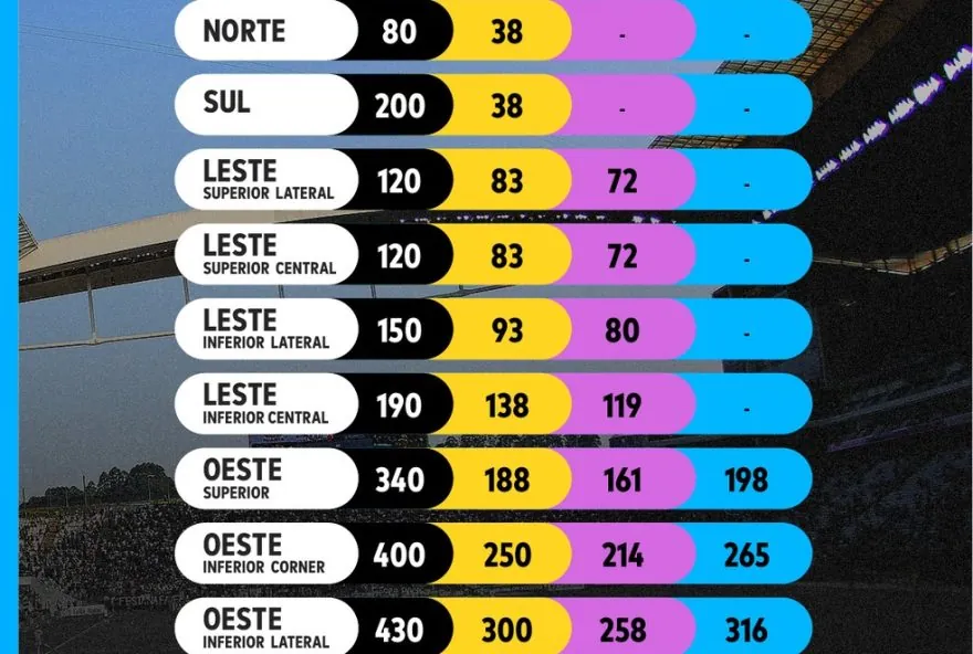 Os preços dos bilhetes vão de R$ 80,00 a R$ 430,00, a depender do setor. Porém, há descontos, que variam de 27% a 81%, conforme o plano do membro do sócio-torcedor.