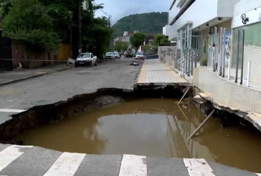 As fortes chuvas que atingiram a Baixada Santista, no último sábado, causaram estragos em São Vicente, Santos e em Guarujá, onde famílias ficaram desalojadas. Já em São Vicente, o impacto da água abriu uma grande cratera na esquina da Avenida Marechal Deodoro com a Rua Pero Lopes de Souza, no bairro Vila Valença, preocupando os moradores.