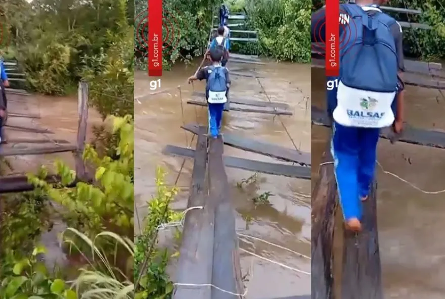 Imagens feitas por moradores mostram estudantes caminhando sobre tábuas deterioradas, parte do que restou da antiga ponte. Para atravessar, os alunos se apoiam em uma corda. A correnteza do rio é forte e os estudantes fazem a travessia descalços. Segundo os moradores, a madeira está escorregadia e frágil.