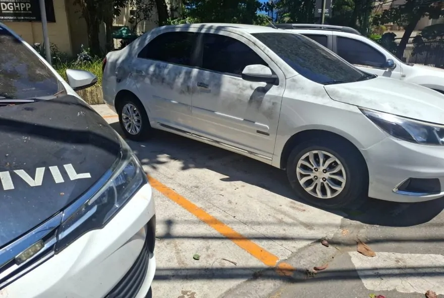 Cobalt usado no crime ao lado de uma viatura na DHC — Foto: Marcos Nunes/Agência O Globo