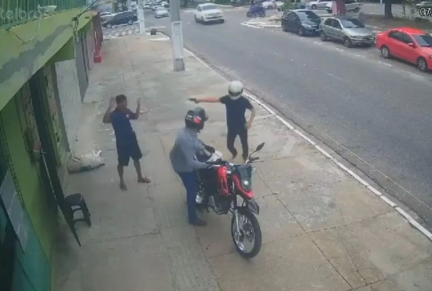 Nas imagens, dois criminosos chegam em uma motocicleta e param em frente ao
